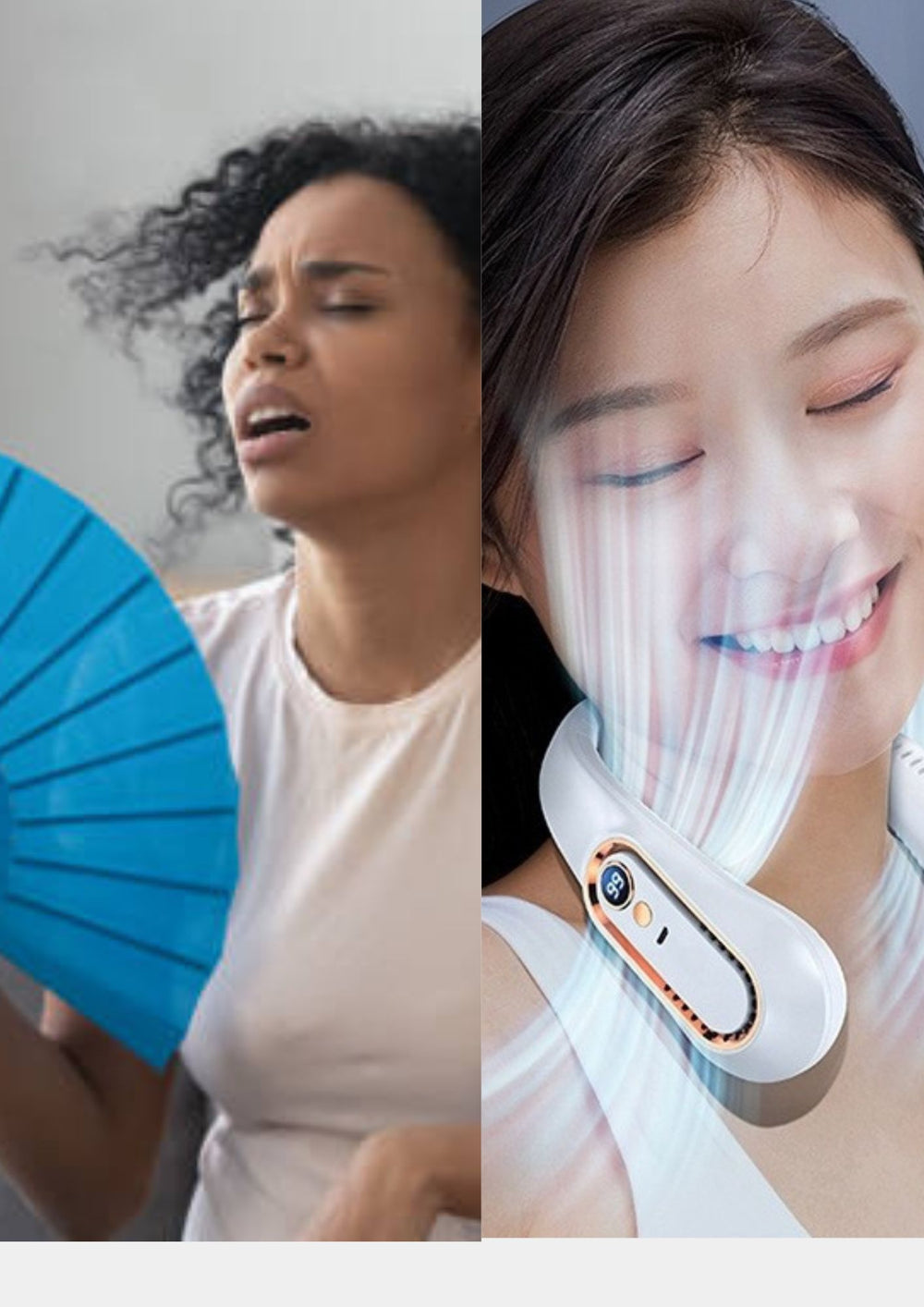 Équipé de deux sorties d'air puissantes de chaque côté, ce mini ventilateur diffuse un flux d'air frais à 360°, couvrant toute la zone du visage et du cou. Il offre un soulagement immédiat pendant les fortes chaleurs, que vous soyez en déplacement, en plein air ou à la